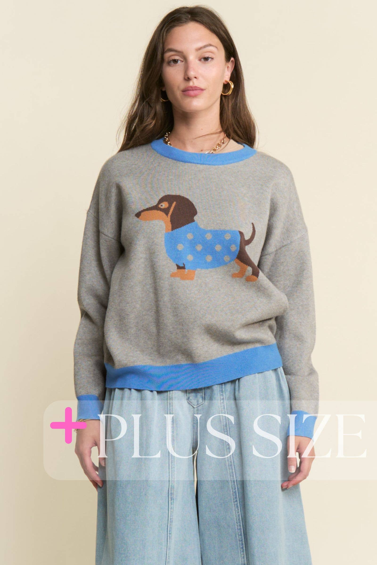 Mjukt stickad damtröja med färgblock och julmotiv föreställande en tax. En bekväm och festlig pullover för säsongen.