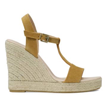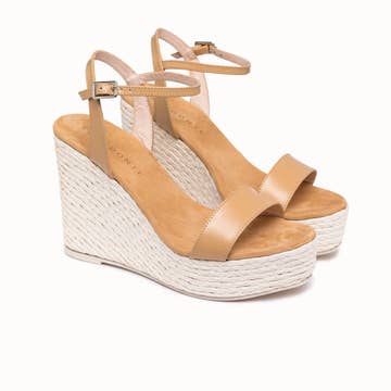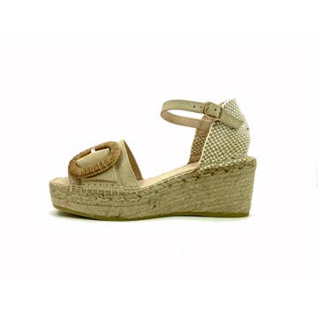 Beige espadrill med naturjute. Låg kilklack och vadderad innersula för maximal komfort. Läder | Spänne | Korksula | Höjd 3–7 cm