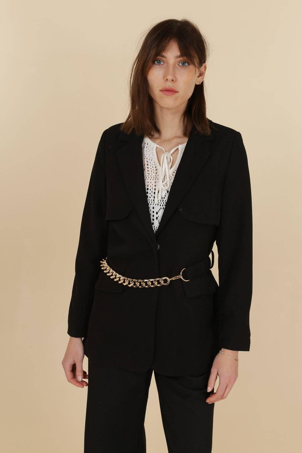 En monterad kavaj med öppen front och en asymmetrisk nederkant är en modern och elegant bit som ger en touch av sofistikering till alla kläder. Den monterade siluetten skapar ett snyggt och polerat utseende, medan den öppna fronten och asymmetriska fållen ger visuellt intresse och en modern twist till den klassiska blazer-stilen.