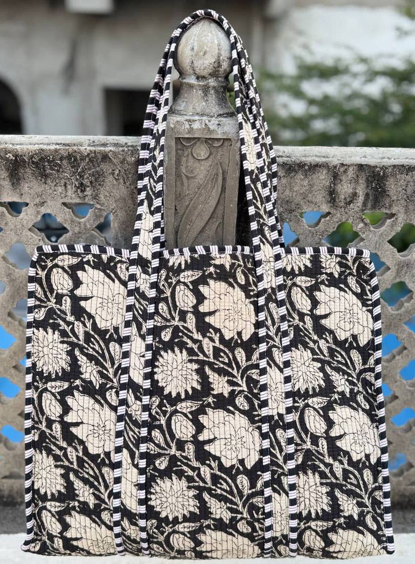 Bomullsväska med tryck, quiltad tygkasse för matvaror och marknad