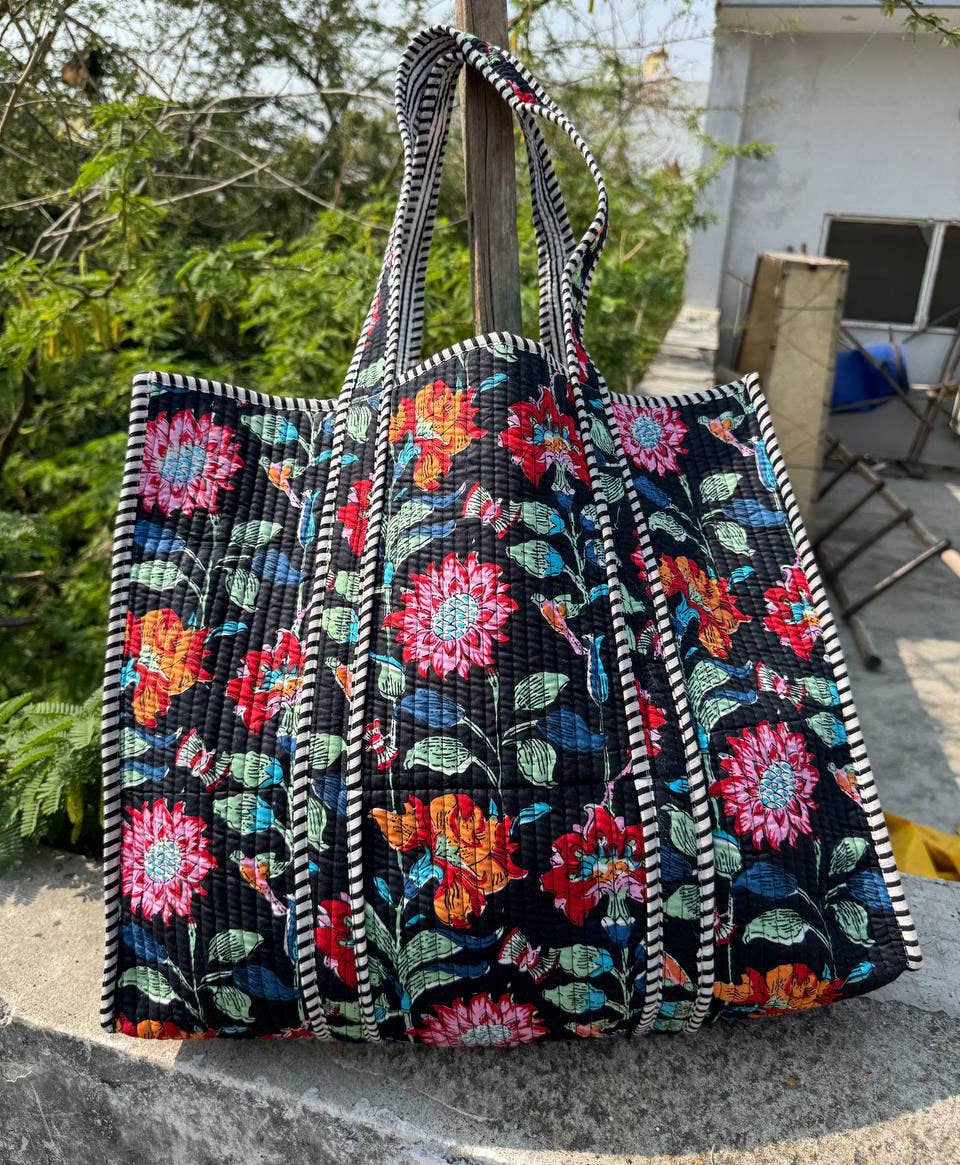 Designade indiska bomullsväskor med tryck, för tjejer och som tygkassar. Indisk handväska i bomull med screentryck och quiltad design, tillverkad i Rajasthan, Indien. Handväskan är helt och hållet tryckt på bomull av hög kvalitet. Den quiltade bomullsväskan är gjord av indiska hantverkare och är helt unik och mångsidig. Använd den för matvaror eller som reseväska. Passar alla. Artikel: Bomullshandväska Mått: - Höjd: 46 cm (18 tum) - Bredd: 46 cm (18 tum) - Handtag: 28 cm (11 tum) - Sidostycke: 14 cm (5,5 tum) Ficka: Inuti Material: Bomull Teknik: Quiltad Mönster: Blommönster Stil: Tygkasse Färg: Som på bild Tvättråd: Kemtvätt