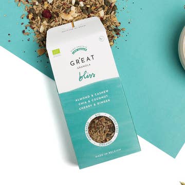 Ingredienser: Certifierad glutenfri havregryn, expellerpressad rapsolja, vegan mörk chokladchips (osötad choklad, rörsocker), ekologisk dadelsirap, osötade kokosflingor, körsbär, matcha, pulver Innehåller kokosnöt.