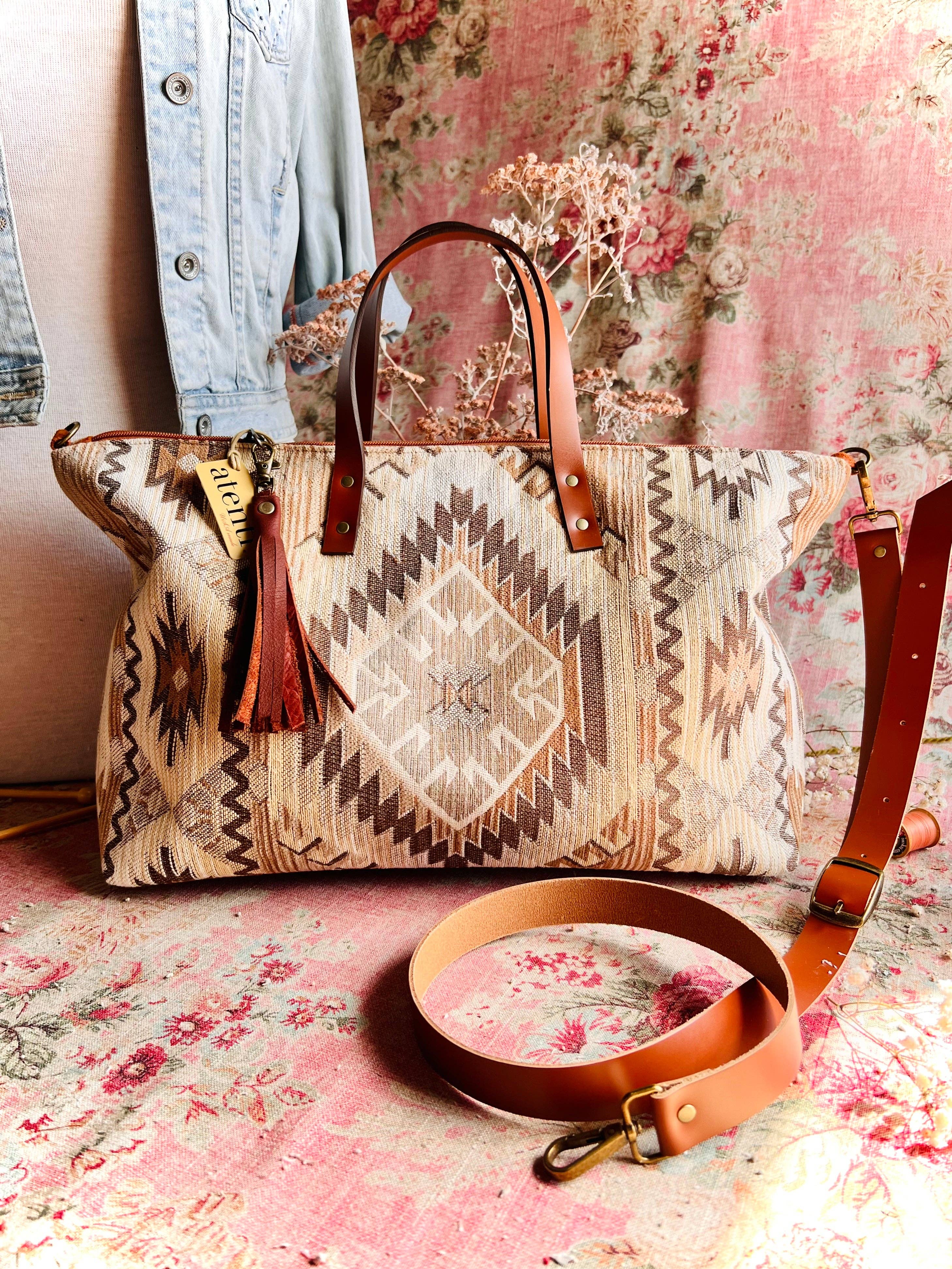 Klassiskt sydvästligt mönster utsmyckat med nickelfläckar och Swarovski-kristaller. En utmärkt form för en rymlig bärväska, Atenti Satchel har en 18" blixtlåsöppning och dubbla 30" remmar. Insidan är helt fodrad i vattentät taft och har en blixtlåsficka och en öppen delad ficka med en mobiltelefonplats. MSRP: Partipris gånger 2.2 (minimum) Dimension: 19.00 ”B x 14.00" H x 5.50" D
