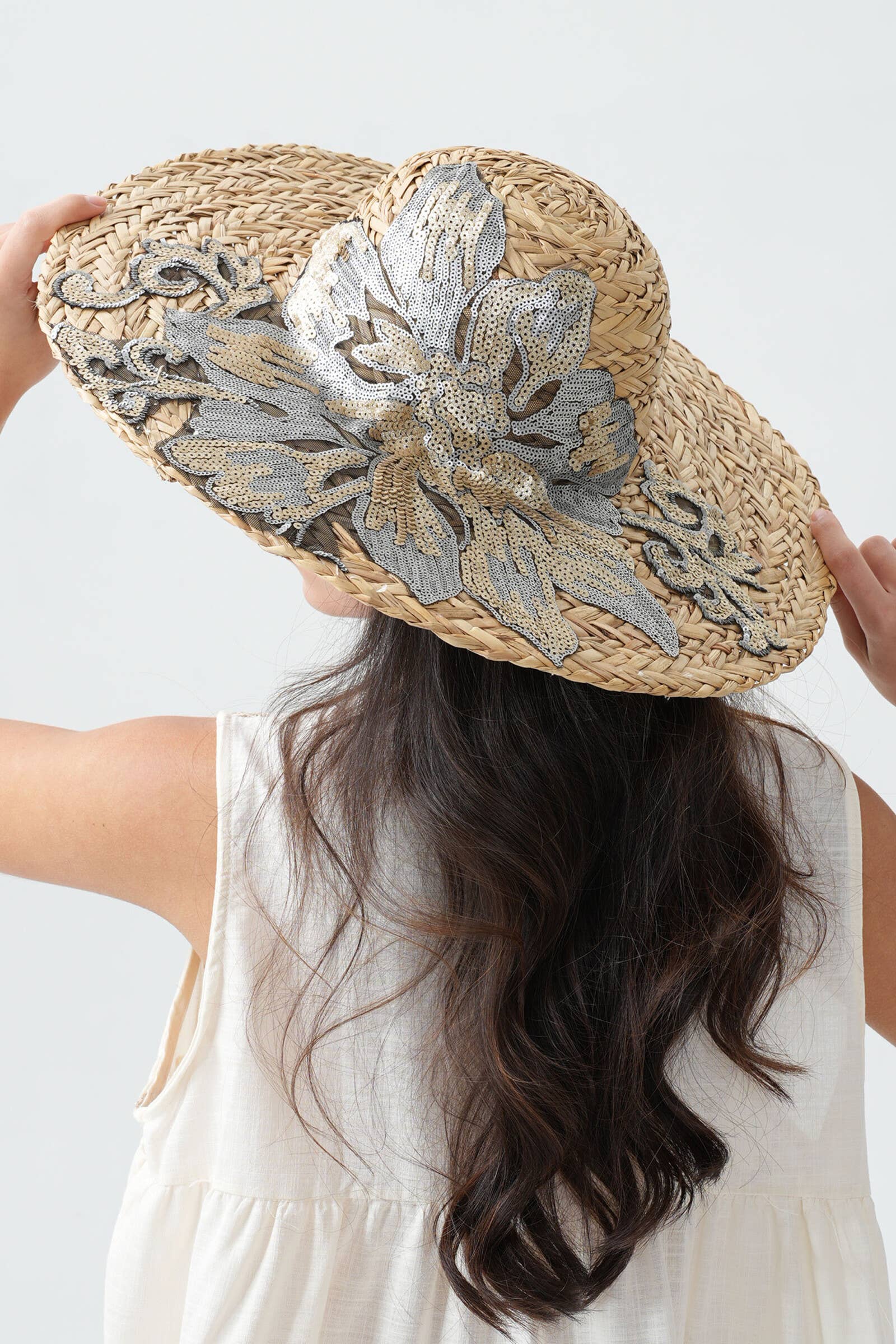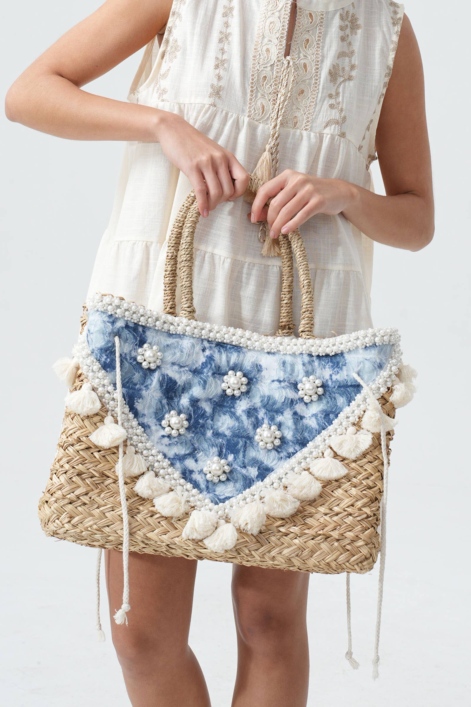 Ge dina sommardagar en touch av glamour och elegans med denna stråväska. Finstämd spets pryder väskan och subtila paljetter ger en elegant och festlig glans. Den rymliga väskan är det perfekta tillbehöret för stadsturer, dagar på stranden eller sommarresor och kombinerar praktisk användning med stil.