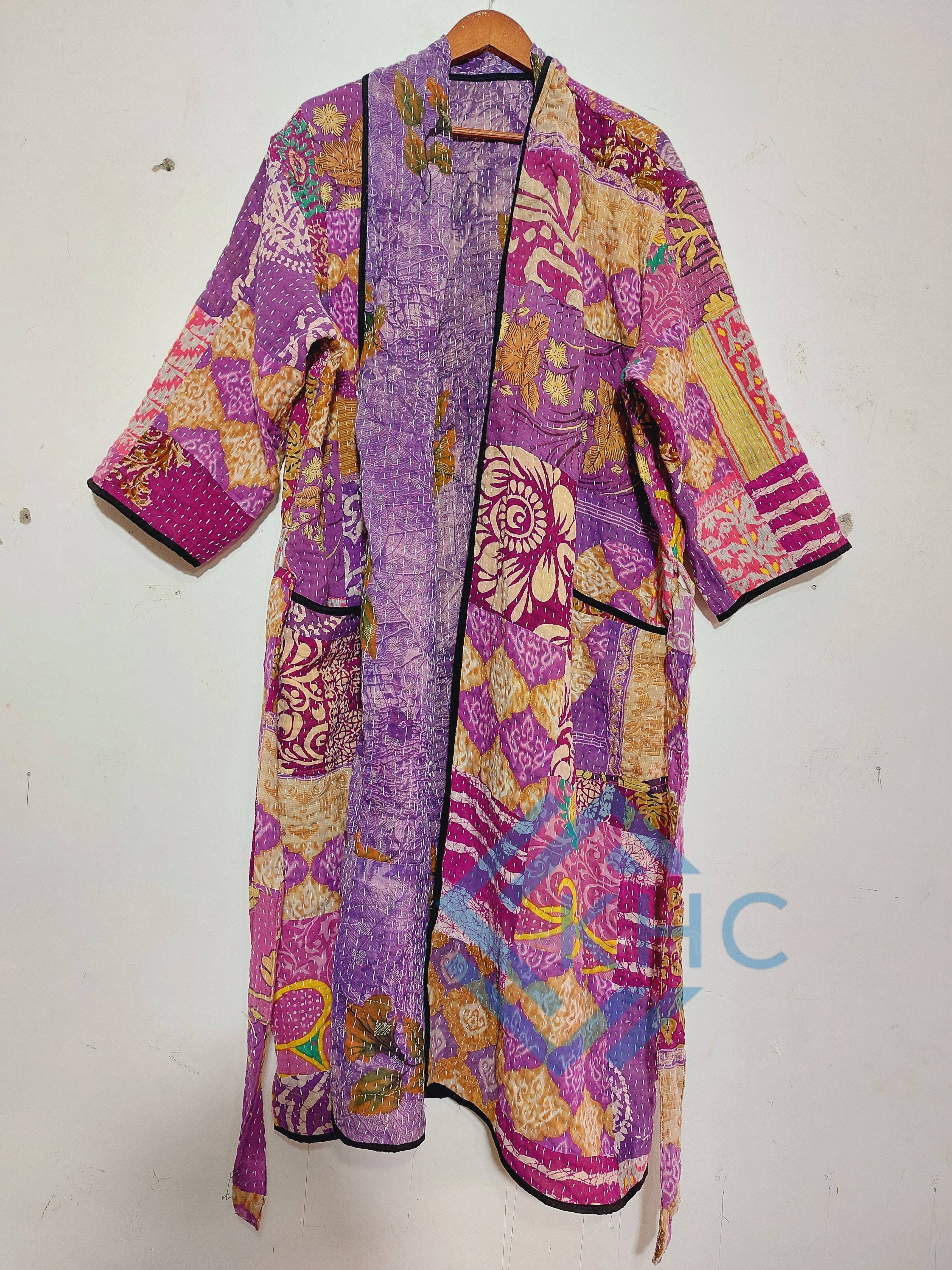 Blandad Vintage Kantha Bomull Patchwork Kimono Lång Morgonrock