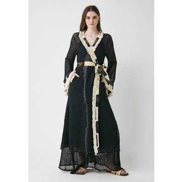 Vi presenterar vår tidlösa flytande kimono. Detta fantastiska stycke är en hyllning till färg och kreativitet som har ett asymmetriskt snitt genomgående med rynkade detaljer och har en avslappnad midilängd. Kimonon är lätt och flytande och draperar vackert över alla kläder, vilket gör den till det perfekta tillbehöret för lager på de svalare sommarkvällarna eller för att lägga till en färgklick till en dagtidsensemble. Handgjorda subtila strassutsmyckningar är utspridda överallt, vilket ger precis rätt mängd gnista för att fånga ljuset och vända blicken. En storlek, lös passform. Alla våra artiklar är handgjorda och gjorda på beställning, vilket säkerställer att varje bit är lika unik som bäraren. Alla våra artiklar är handgjorda och gjorda på beställning, vilket säkerställer att varje bit är lika unik som bäraren. Vänligen tillåt cirka 4 veckor för leverans.