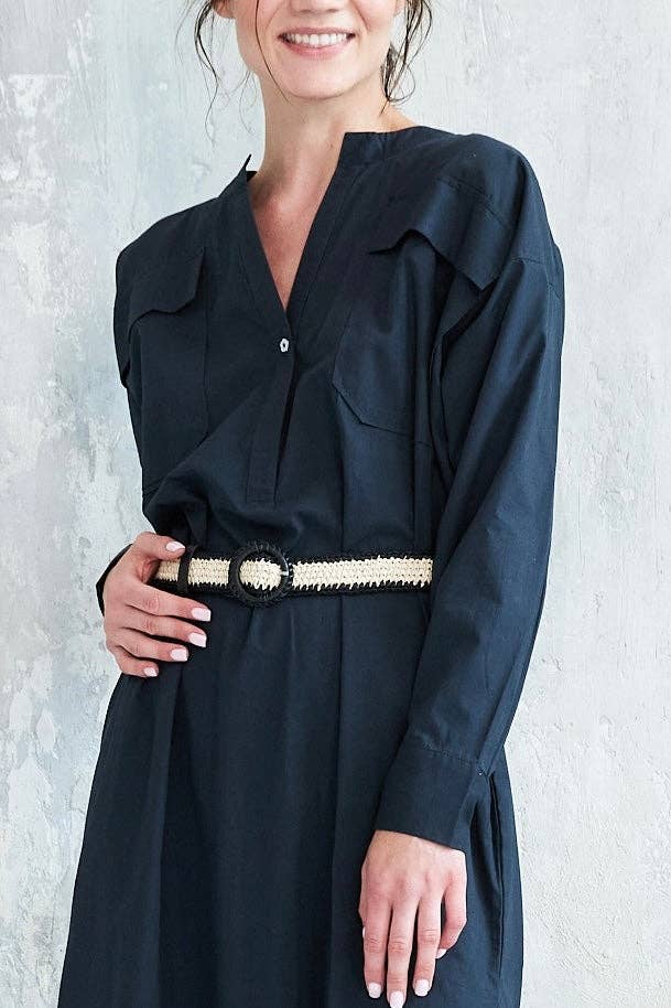 Ge din stil en krydda med vårt raffiabälte! Handgjort med spänne och ögla i läder, det tillför en unik touch till alla dina outfits. Vänd blickarna med denna originella modell som förenar tradition och modernitet. Beskrivning: - Flätat raffiabälte, handgjort - Spänne och ögla i läder - Färg: naturlig/blå - Modell skapad i Frankrike, tillverkad i Indien Material: Raffia, läder