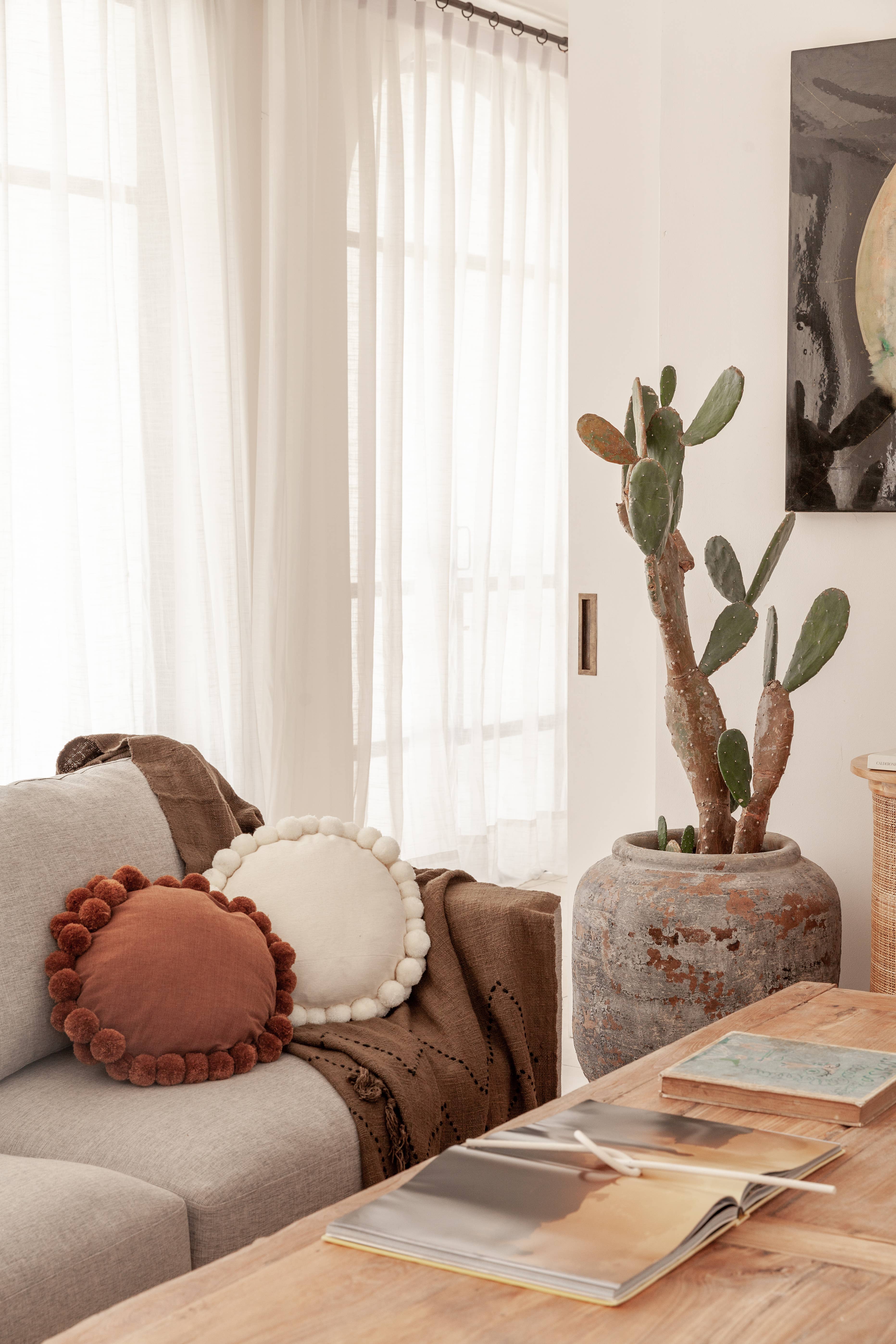 Handgjorda av ekologisk bomull, dessa runda kuddar med pom pom fransar kommer säkert att göra ett vackert uttalande var de än landar i ditt hem. Styla dem tillsammans eller separat, varje kudde är hantverkstillverkad och designad i den varmaste uppsättningen rika toner, den perfekta lösningen för att mysa ditt hem! Förbättra ditt hem med vår exklusiva höst 2024-kollektion, med mysiga vintersaker och festliga julaccenter, perfekt för din höstdekor. *Välj om du vill inkludera kuddinsats eller inte. Storlek: 17" diameter Material: Bomull