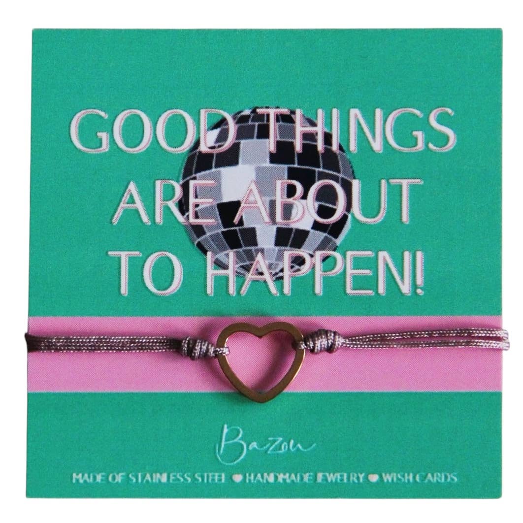ÖNSKEKORT MED ARMBAND ♥ Ett kärleksfullt budskap med en vacker gåva. Överraska dina nära och kära med våra glada gratulationskort med matchande armband! Perfekt för att gratulera någon, önska lycka till, ge en klapp på axeln eller bara visa att de är fantastiska. På baksidan av kortet finns plats för en personlig hälsning som gör din önskan extra speciell. Det medföljande armbandet blir ett bestående minne av dina vänliga ord. En liten gest med stor betydelse. Armbandet är gjort av satintråd kombinerat med ett hjärta i rostfritt stål med guldfärg. Armbandet har en justerbar knut och passar därför varje handled.