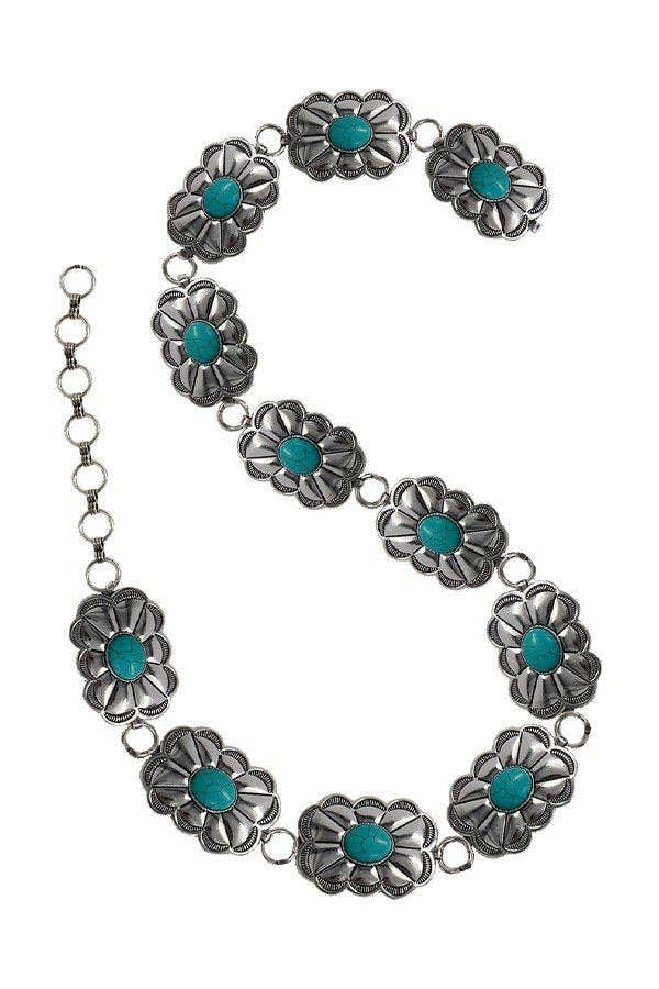 VÄSTERLÄNDSK CONCHO DESIGN TURKOS STENKEDJEBÄLTE STOR: ANTAL DELAR: 12 HÖGKVALITATIV TURKOS STEN MED ZINKGJUTNINGSBAS STORLEK: 42+7.25 TUM EXT LITEN: ANTAL DELAR: 10 HÖGKVALITATIV TURKOS STEN MED ZINKGJUTNINGSBAS STORLEK: 35,5+7,25 TUM EXT