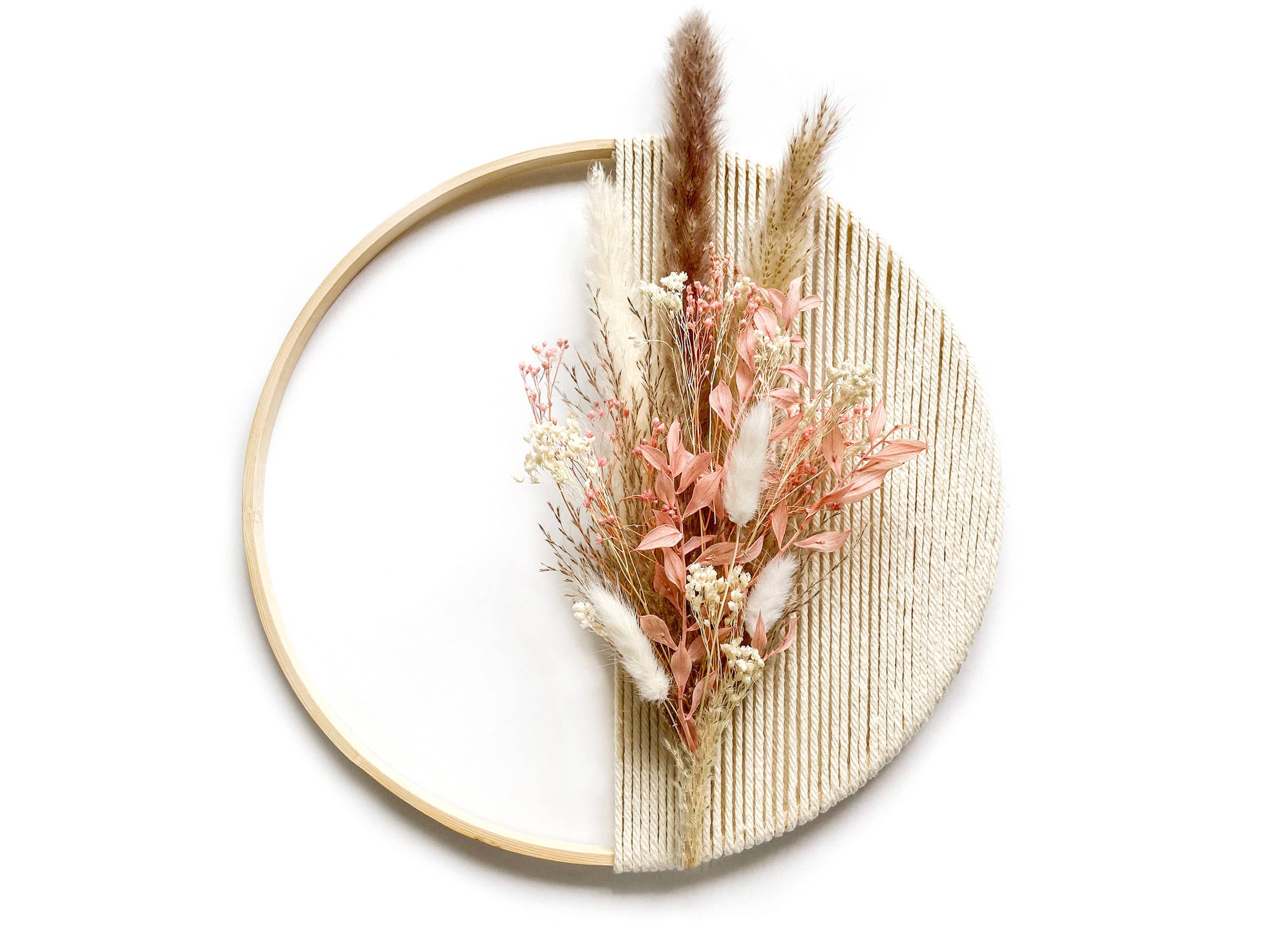 Lägg till ett uttalande till ditt utrymme med denna Macramé Pampas gräskrans. Denna väggdekor är perfekt att hängas på väggar och dörrar och är ett utmärkt sätt att lägga till lite rustik chic touch till ditt utrymme. Den är gjord med en träbåge och ett sortiment av torkade blommor och lövverk. Vänligen notera, ringstorleksmätningarna inkluderar inte den extra mätningen av blommarrangemanget som är fäst vid det. Eftersom denna produkt är handgjord, vänligen tillåt mindre variationer.